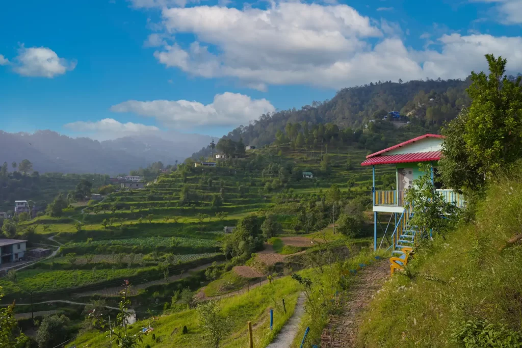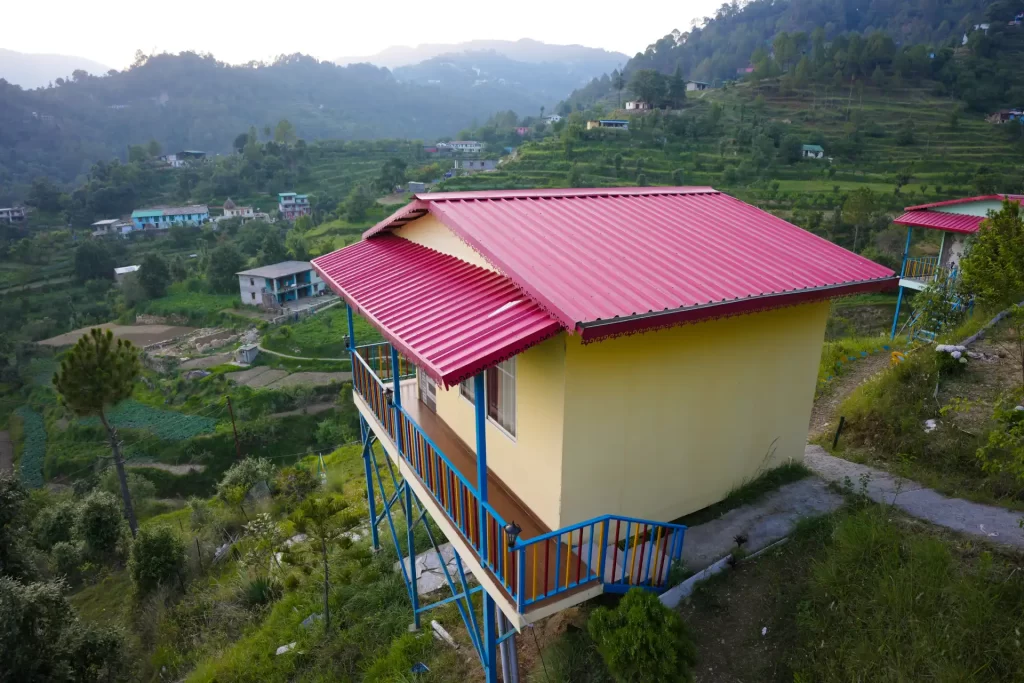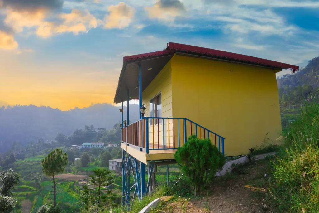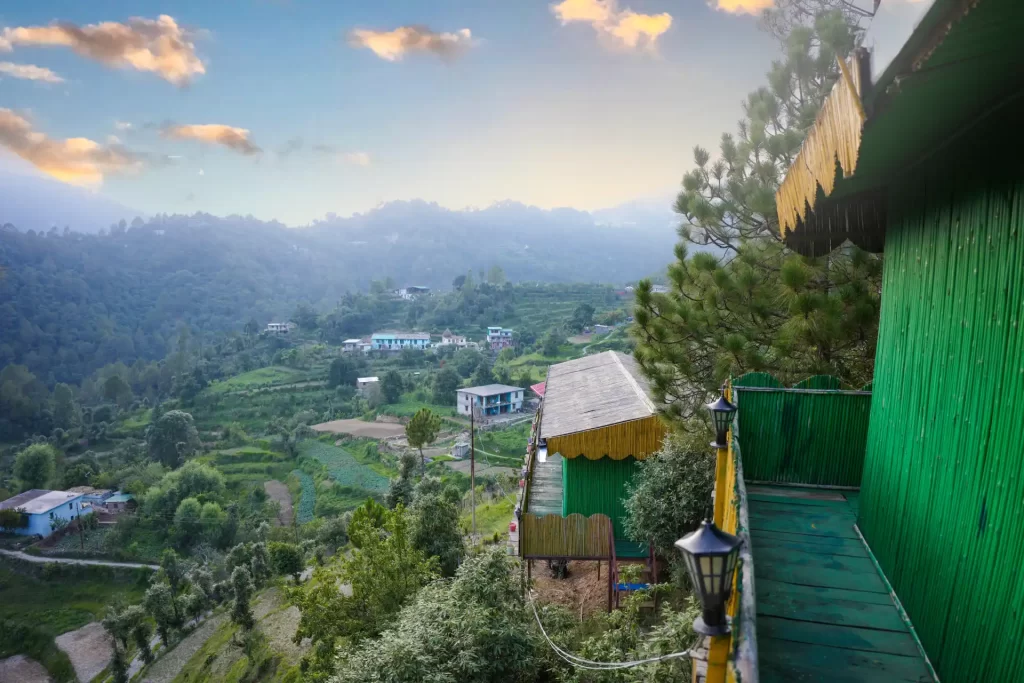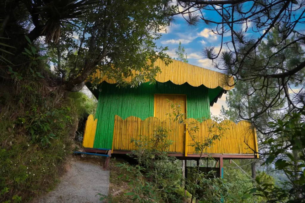 Built with natural materials and surrounded by greenery, the Bamboo Nest Cottages in Mukteshwar offers a cozy space that blends with nature. Enjoy morning mist, peaceful evenings, and warm, cottage-style interiors.